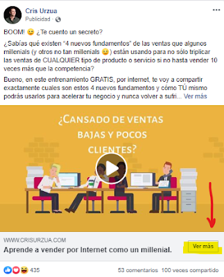 El siguiente anuncio de Cris Urzua lo hace bien al enviar al usuario a una página de destino específica para brindar información de sus cursos y talleres: